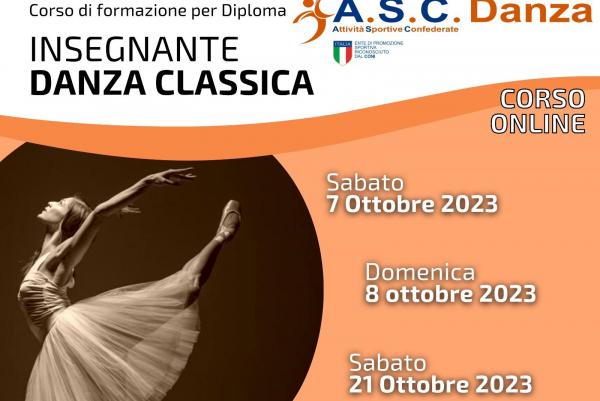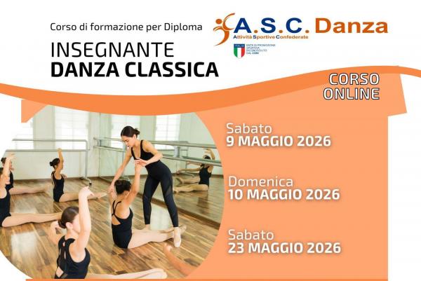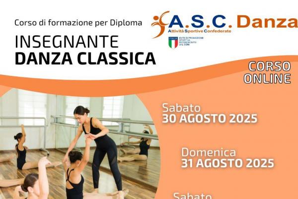 L'A.S.C. DANZA è un centro formazione di alta qualità e specializzato nella preparazione di coloro che aspirano al conseguimento del diploma di Insegnante di Danza Classica. Il corso di formazione prepara con professionalità ad intraprendere la carriera di Insegnante Danza Classica ed è rivolto a coloro che sono già in possesso di un buon bagaglio tecnico nella disciplina. Al termine del percorso formativo verrà verificata l'abilità tecnica e didattica di ogni candidato attraverso un esame di fine corso. Il diploma rilasciato è riconosciuto a livello nazionale da A.S.C./CONI.