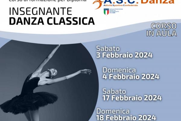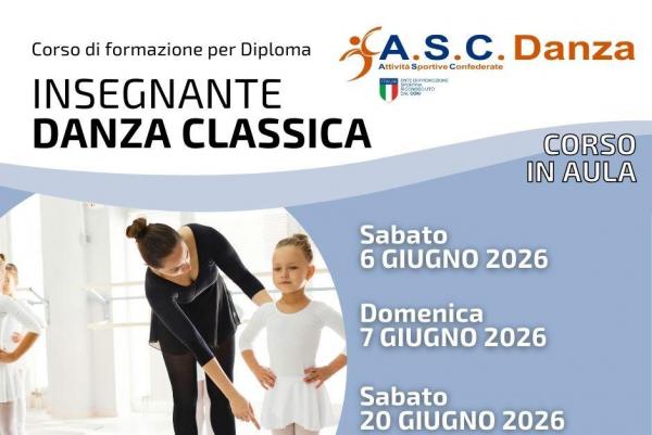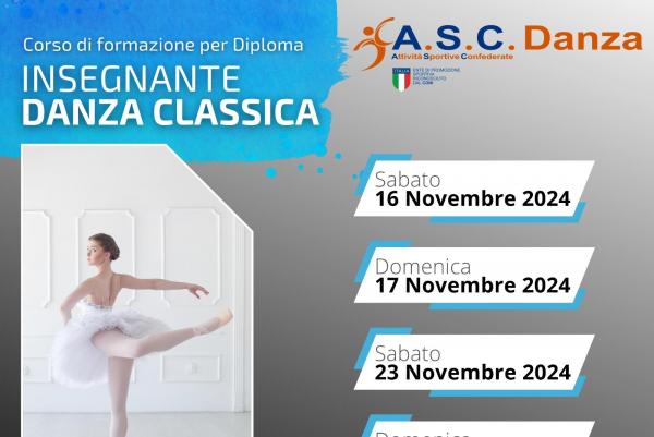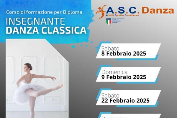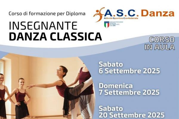 L'A.S.C. DANZA è un centro formazione di alta qualità e specializzato nella preparazione di coloro che aspirano al conseguimento del diploma di Insegnante di Danza Classica. Il corso di formazione prepara con professionalità ad intraprendere la carriera di Insegnante Danza Classica ed è rivolto a coloro che sono già in possesso di un buon bagaglio tecnico nella disciplina. Al termine del percorso formativo verrà verificata l'abilità tecnica e didattica di ogni candidato attraverso un esame di fine corso. Il diploma rilasciato è riconosciuto a livello nazionale da A.S.C./CONI.