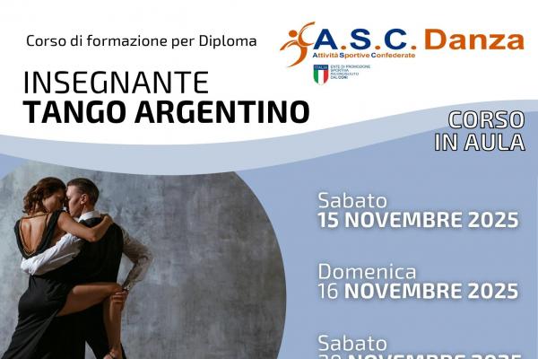 Tale formazione professionale consentirà ai partecipanti di conseguire, previo esame finale, il diploma e il tesserino di Insegnante in Tango Argentino rilasciato da ASC, ente di promozione sportiva riconosciuto CONI e valido per l’insegnamento in tutti i centri sportivi, associazioni, scuole di ballo e danza. Diploma valido ai fini delle agevolazioni fiscali per l’attività Sportiva Dilettantistica (ART. 25 del DLGS 36 del 2021).