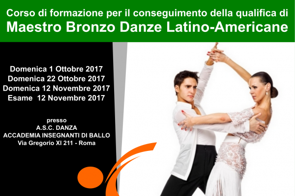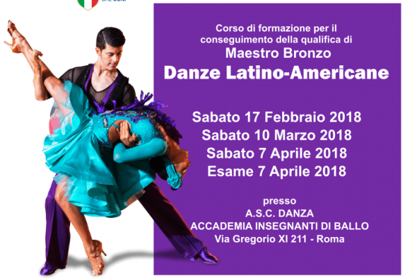 studio di base delle danze latinoamericane, programma dei balli: Cha Cha Cha, Samba, Paso Doble, Rumba e Jive. Viene richiesta una forte predisposizione all'insegnamento,dinamicità e preparazione di base.