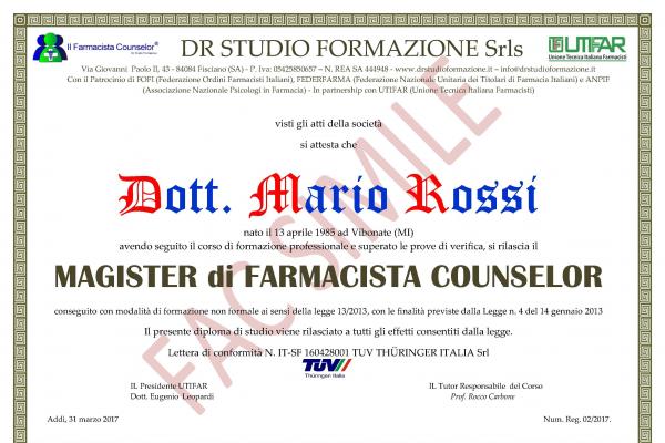 Si dopo aver superato le prove di verifica d'area e compililato un questionario di gradimento, viene rilasciato un diploma di Magister di Farmacista Counselor necessario per iscriversi nell'elenco professionale dei Farmacisti Counsleor.