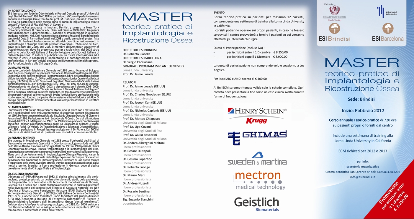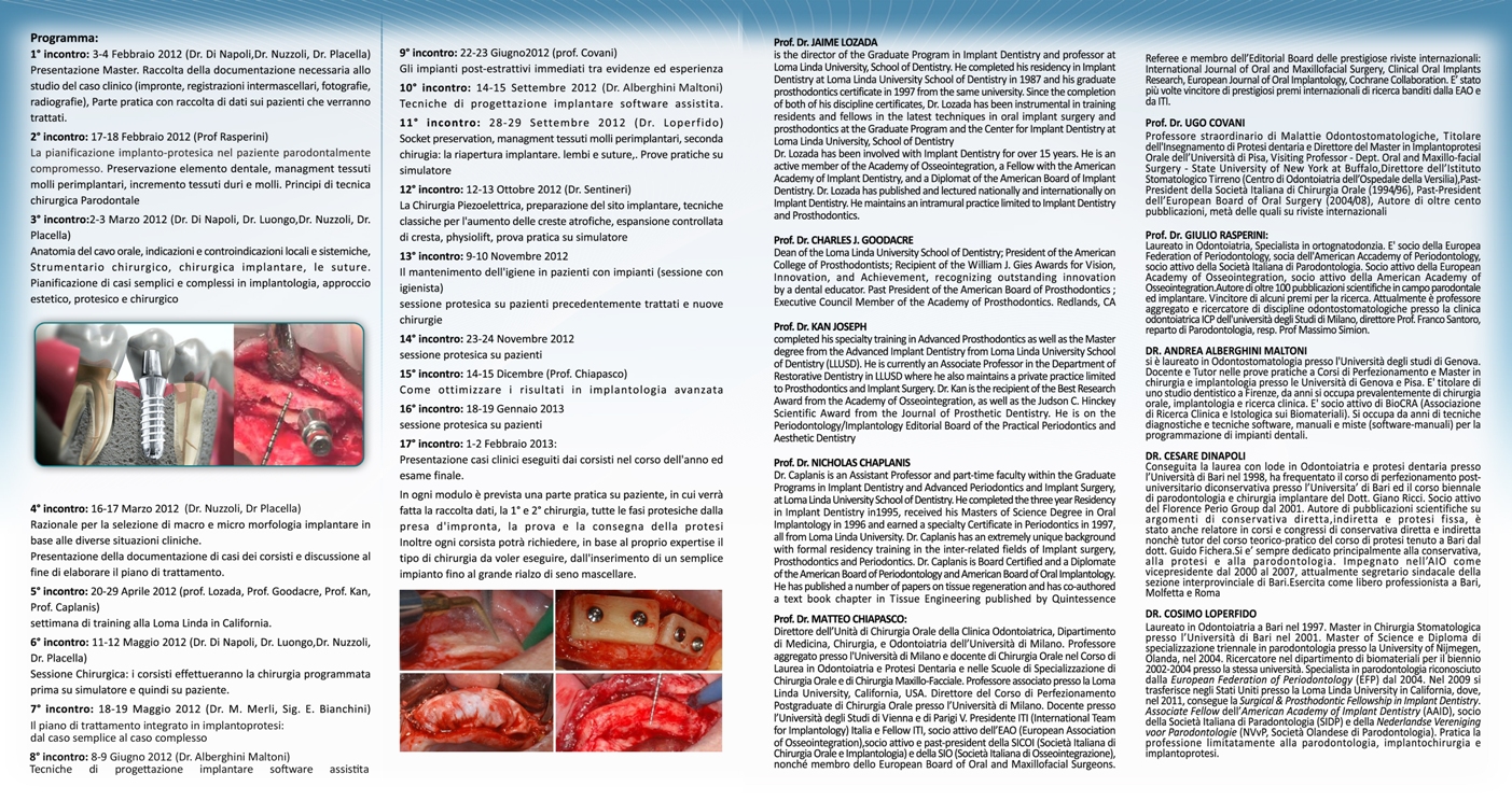 Obiettivo del corso: Ad affrontare casi di implantologia con tranquillità e sicurezza, e con le nozioni necessarie a programmare qualsiasi intervento nel modo più corretto. Rivolto a: odontoiatri che vogliano affacciarsi all'implantologia imparando dei più illustri esponenti di questa branca a livello italiano e internazionale, ma anche a chi voglia imparare e/o affinare tecniche di rigenerazione e/o implantologia avanzata. Il corso è stato realizzato per dare la possibilità ai corsisti di provare tecniche e metodologie che non avevano provato precedentemente, nel fare questo saranno assistiti da professionisti esperti nel settore. inoltre la settimana a los angeles oltre a dare la possibilità di conoscere professionisti provenienti da tutto il mondo , permetterà ai corsisti di avere un contatto diretto con gli esponenti di tale università con la possibilità per chi volesse di affrontare un discorso di resident o fellow di 2 anni direttamente nell'università. inoltre il conseguimento del diploma permette ai corsisti di iscriversi all'unico maxicourse presente in europa per poter diventare associate fellow della AAID (american Accademy of Implant Dentistry).