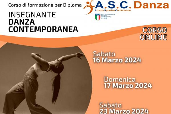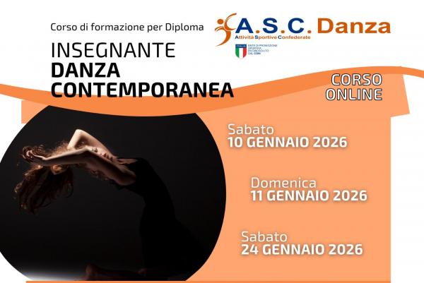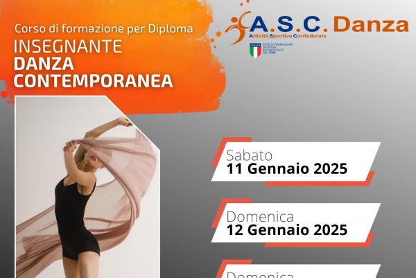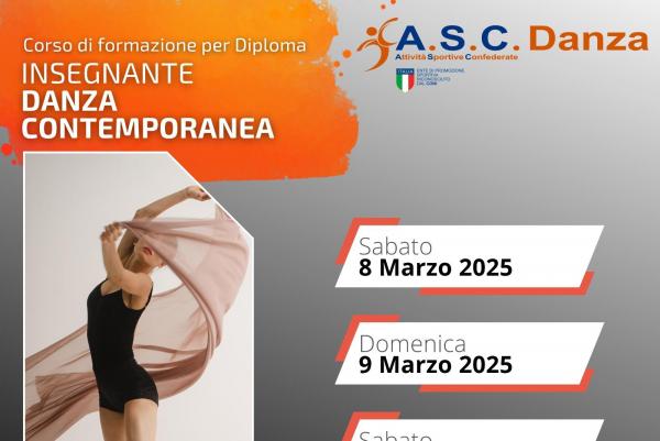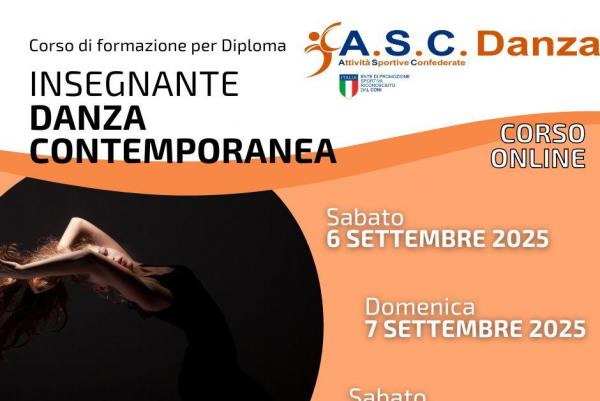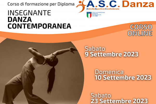 La finalità del percorso professionale è quella di creare una figura di Insegnante di Danza Contemporanea con un notevole bagaglio di competenze tecniche della disciplina che lo renderà professionista del settore.Tale formazione professionale consentirà ai partecipanti di conseguire, previo esame finale, il diploma e il tesserino di Insegnante in Danza Contemporanea rilasciato da ASC, ente di promozione sportiva riconosciuto CONI e valido per l’insegnamento in tutti i centri sportivi, associazioni, scuole di ballo e danza. Diploma valido ai fini delle agevolazioni fiscali per l’attività Sportiva Dilettantistica (ART. 25 del DLGS 36 del 2021).