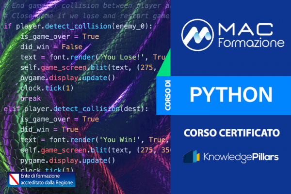 Il corso Python , al termine della formazione completata con profitto, rilascia un attestato numerato e personale, tracciabile attraverso il sito Web con certificazione ente ISO 9001:2015 EA37 per la formazione professionale valida in tutta Europa.