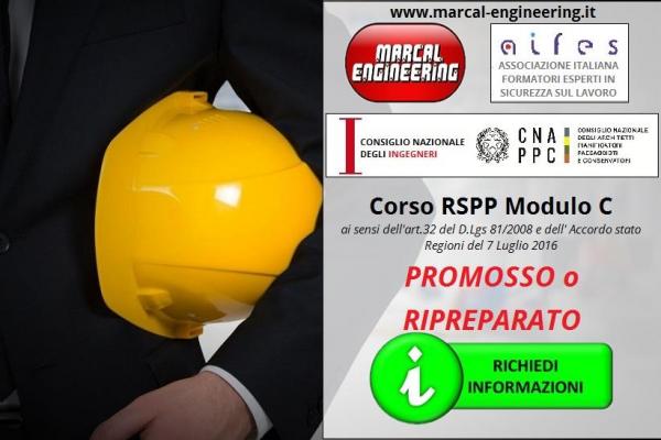 Marcal Engineering sas presenta agli utenti di emagister.it il corso di RSPP Modulo C, una formazione volta a conseguire la qualifica di Responsabile del Servizio di Prevenzione e Protezione Modulo C, una specializzazione che completa il percorso degli RSPP e che permette agli Ingegneri iscritti ad un qualsiasi albo provinciale di conseguire 24 Crediti formativi per l'aggiornamento professionale obbligatorio. La Marcal engineering è infatti anche Provider accreditato dal C.N.I. (consiglio nazionale degli ingegneri) per la formazione obbligatoria degli stessi.