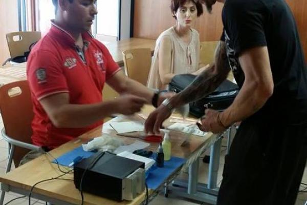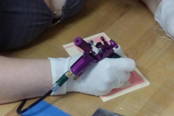 Pratica di tatuaggio su materiali appositi (pelle sintetica).