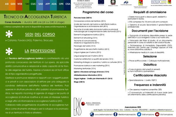Il centro di formazione Associazione Eris presenta sul portale di Emagister Tecnico di Accoglienza Turistica, un corso gratuito della durata di 680 ore (di cui 240 in stage) con indennità di 4 euro lorde al giorno (all'ottenimento della certificazione prevista).